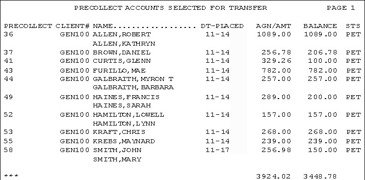 Use this option to generate a list of precollect accounts to review before actually transferring them to trust. Though this option uses the same criteria used to transfer account, it does not actually transfer the accounts.