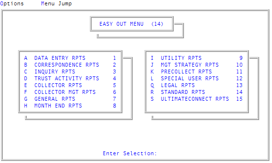 For example, to print, view, or send a Collector report, type 5 or E at the Enter Selection prompt, and press Enter.