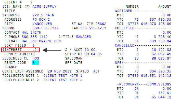 Interest field, type the annual interest rate this client charges, as a decimal (for example, 12% = .12), and press Enter.