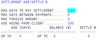 In the Max Days To Pay Settlement field in the Settlement Age/Settle % screen, type a number, and press Enter. - In the Max Days Between Payments field, type a number, and press Enter.