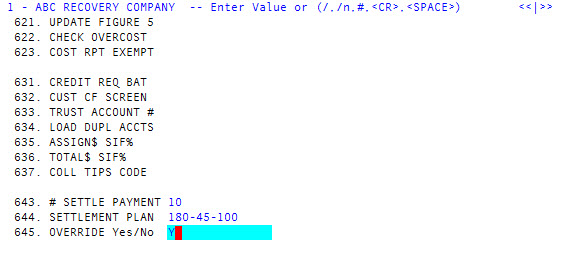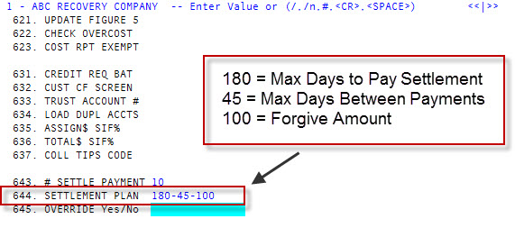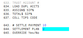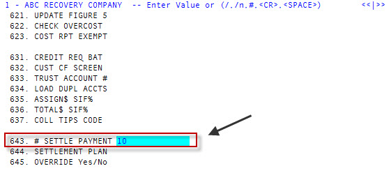 In field 643, # Settle Payment, type the maximum number of payments in which a settlement plan must be completed for this client, and press Enter. -