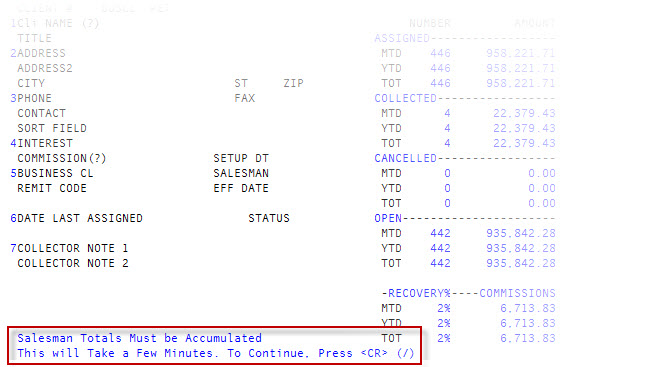 Use this option to view the total number of accounts and amounts assigned, collected, canceled, and open for each specified salesperson listed in The Collector System. The screen also displays the total recovery percentage and commissions for each salesperson.
