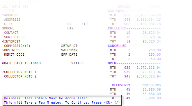 Use this option to view the total number of accounts and amounts assigned, collected, canceled, and open for each specified business class. The screen also displays the total recovery percentage and commissions for each business class.