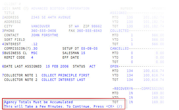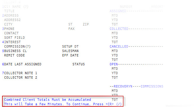 Use this option to view the total number of accounts and amounts assigned, collected, canceled, and open for all the clients in The Collector System. The screen also displays the total recovery percentage and commissions for all your clients.