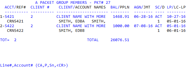 Use this option to view the details of the packet groups the account belongs to, such as the number of accounts, account numbers, clients, balances, and statuses for each account in the packet group.