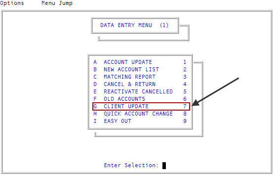 From the Master menu, navigate to Data Entry > Client Update (menu 1.7).