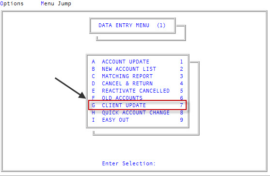 From the Master menu, navigate to Data Entry > Client Update (menu 1.7).
