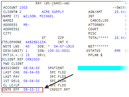 The interest effective date is not permanently stored on the Account Update screen. When a function updates interest, the date in the Intr Eff field changes. A permanent record of interest effective date changes is kept in the notes.