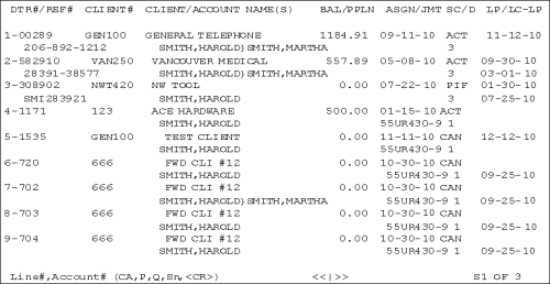 View the balance owing (Packet Display) and other important information about each account in a packet (/P) or all associated packets (/PA). This is an example of a Packet Display screen: |