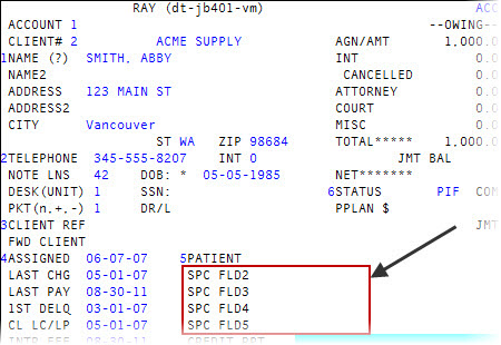 The Account Update screen has five, optional, special fields. These field can hold information useful to your agency. Examples of possible uses are storing insurance company information, a physician's name, a spouse or second payer's social security number, attorney information, and so on.