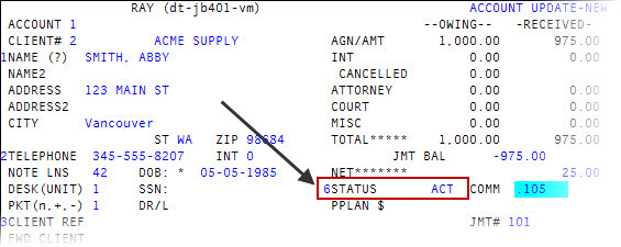 The Status field of the Account Update screen stores a code that tells The Collector System the status of the account. This is referred to as the status code. If you do not enter a status code in the field, The Collector System automatically populates it with ACT (active) or, if your agency uses a house desk, HSE (house account).
