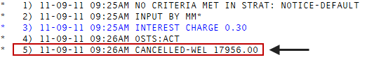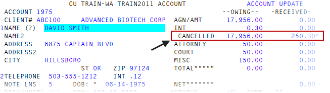 When you cancel an account, in the financial area of the Account Update and Collector screens, the canceled field displays the canceled portion of the assigned amount in the Owing column. The total of the interest and other fees displays with an asterisk in the Received column. If the total amount of the interest and other fees is zero, nothing displays in the Received column. The system ignores any remaining judgment amounts.