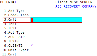 For a list of the commands available in this field, see Using client name field options. In the Client Misc Screen, in the Omit field, do one of the following, and press Enter: