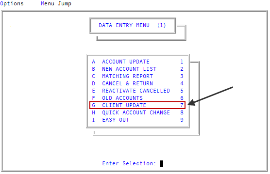 From the Master menu, navigate to Data Entry > Client Update (menu 1.7).