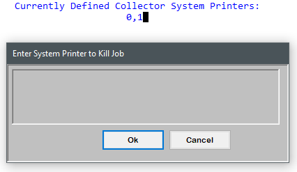 In the Enter System Printer to Kill Job window, type the printer number that contains the print job(s) you want to cancel, and press Enter or click Ok.