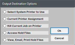 In the Output Destination Options window, select Kill Current Job on Printer, and press Enter or click Ok.