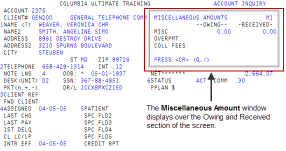 Use command M to view the Miscellaneous Amounts window. Up to nine fields display miscellaneous charges (such as NSF check charges, fees, and other associated charges) in this window.