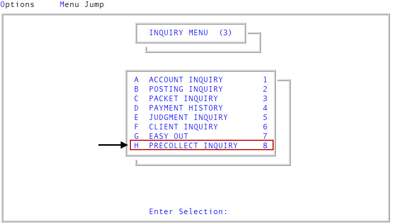 From the Master menu, navigate to Inquiry > Precollect Inquiry (menu 3.8).