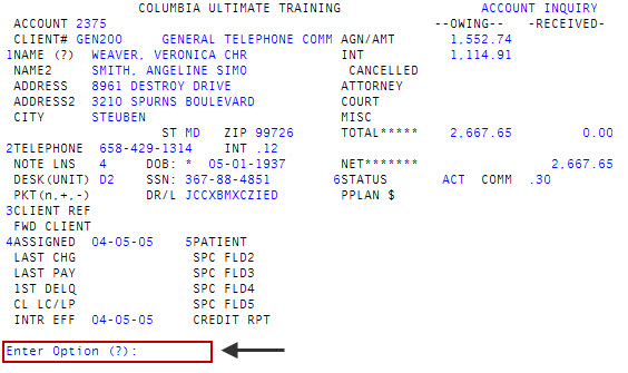 At the Enter Option (?) prompt in the Account Inquiry screen, type one of the commands listed in Using commands in the Account Inquiry screen.