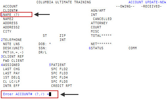 From the Master menu, navigate to Data Entry > Account Update (menu 1.1).