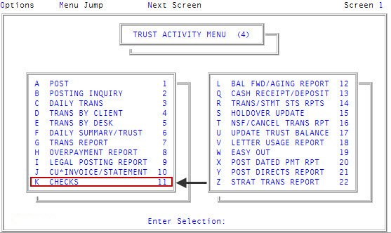 From the Master menu, navigate to Trust Activity > Checks (menu 4.11).