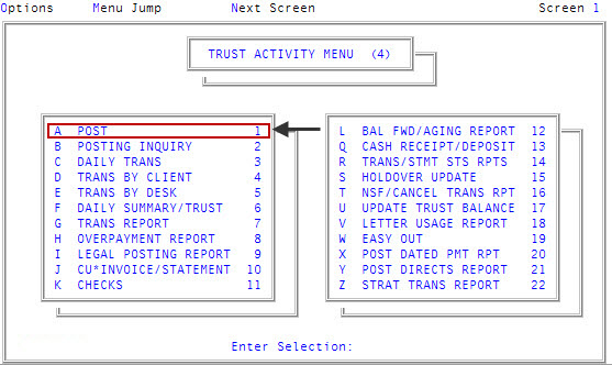From the Master menu, navigate to Trust Activity > Post (menu 4.1).