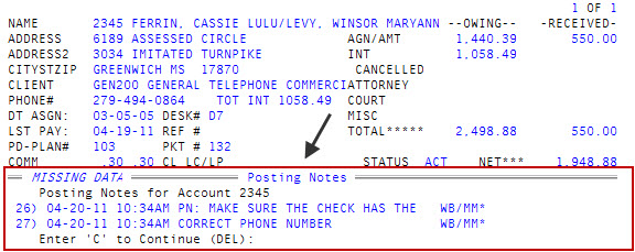 If a collector enters a posting note (PN note) in an account record, the PN note automatically displays on the transaction screen before you enter the transaction information.