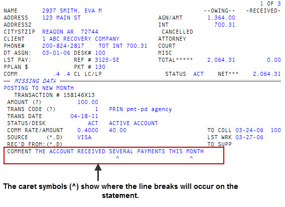 You can add manual comments by typing an asterisk in either the Source (*, D) or the Rec'd From (*, D) fields on the Posting screen. Manual comments must be no more than 50 characters long and they may be displayed over three lines with a maximum of 25 characters per line. If the line breaks in the middle of a word, use one or more extra spaces until the entire word displays on the next line. In the following example, the caret symbols show that the line breaks at the words "several" and "month".