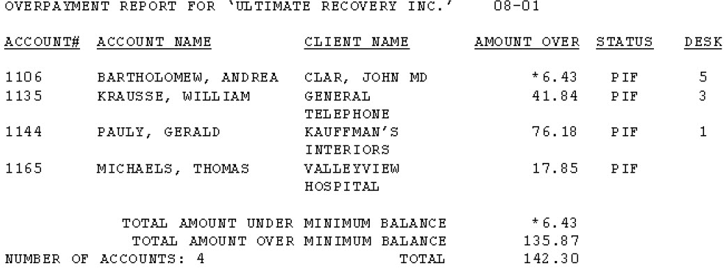 If you have set a minimum balance or overpayments in your agency, any overpayments less than the minimum amount display on the Overpayment report marked with an asterisk. Accounts above the minimum balance have a check request generated for them, while those with balances less than the minimum do not have checks requests generated. If an account is on a judgment, the Overpayment report reflects the judgment. For more information, see Updating the minimum balance.