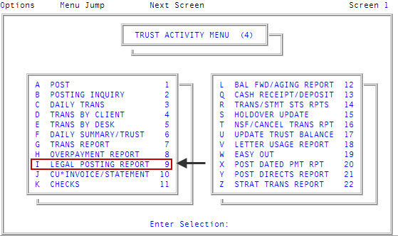 From the Master menu, navigate to Trust Activity > Legal Posting report (menu 4.9).