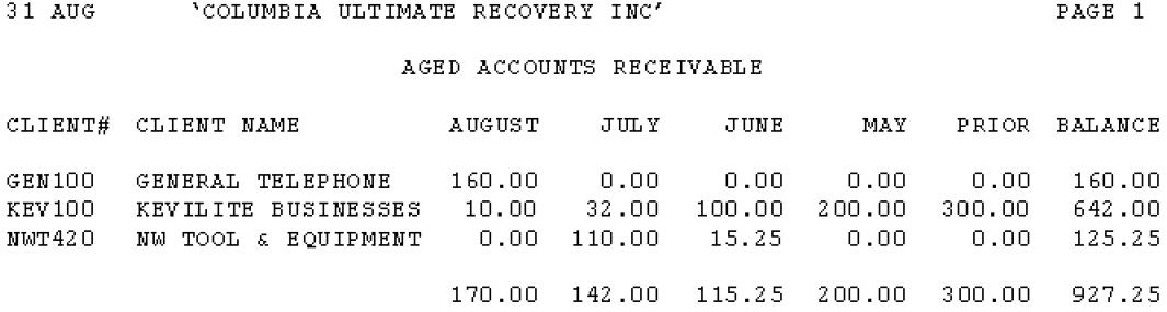 The Aging report calculates the receivables up to the date you enter. For example, if the current date is December 15 and you enter December 10 as the calculation date, the Aging report includes transactions from the current date through December 10. If you press Enter for the current date, it includes transactions up to December 15. However, if you run the report after you print the week 4 statements, the report includes all transactions eligible to appear on the week 4 statement. The Aging report includes holdover transactions eligible to appear on a statement, even if they have not yet actually appeared on a statement. Clients that receive on-request statements have their balance forward calculated as of the last time their statements were requested. The totals include client payments (including Client NSFs) received after you ran the last on-request statement, even though they have not yet appeared on the statement.