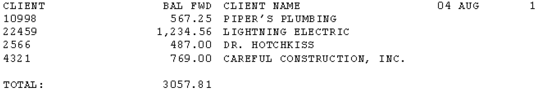 The Balance Forward/Aging report lists clients that owe your agency money from previous billings. It indicates how long each client has been in arrears.
