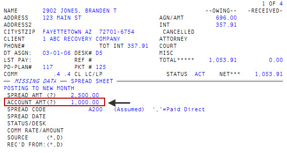 After you press Enter, The Collector System automatically enters the cursor in the Spread Code field. The system assumes you want to perform a spreadsheet post for the entire payment so it automatically enters the amount entered in the Spread Amt (?) field into the Account Amt (?) field. You can go back to the Account Amt (?) field and change the amount.