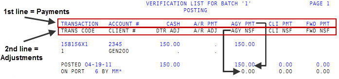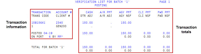 The Batch Verification report screen displays the details of each transaction within a batch. Each column displays two lines of information; the first column line displays payment amount totals for the batch. The second column line displays adjustment amount totals for the batch.