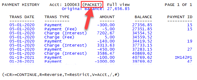 To toggle between viewing payments for the entire packet or an account, type V, and press Enter.
