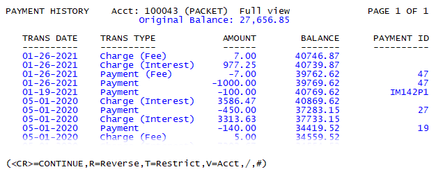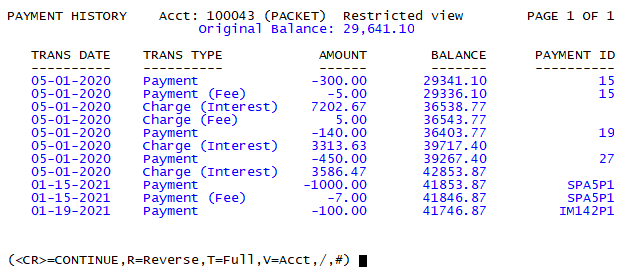 You can view the payment history for an account using the PH command from the command prompt of the collector screen.