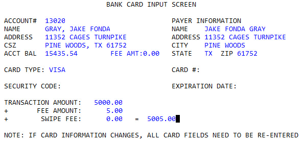 For the Name, Address, City, State, Zip fields of the Bank Card Input screen, do one of the following: