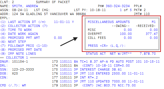 Use command WM to determine if the customer is responsible for miscellaneous charges, such as fees and court costs. Your agency determines the types of fees that display in these windows. Also, if the agency owes the customer an overpayment, that amount displays in these windows. You can only view information in the Miscellaneous Amount windows; you cannot update information.