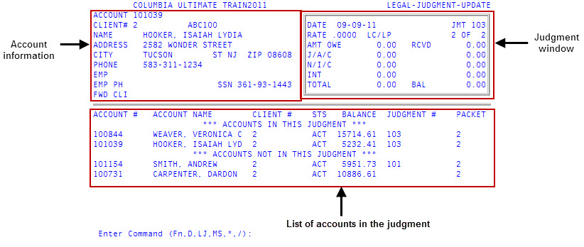 The L J S command displays the Legal Judgment Update screen, which consists of three areas: one area contains information on the account, the Judgment window contains the amount owing and received for the judgment, and the lower half of the screen displays the first 20 judgment fields set up in your Financial Profile. For information, see Menu 10.1.9 - Financial Screens.