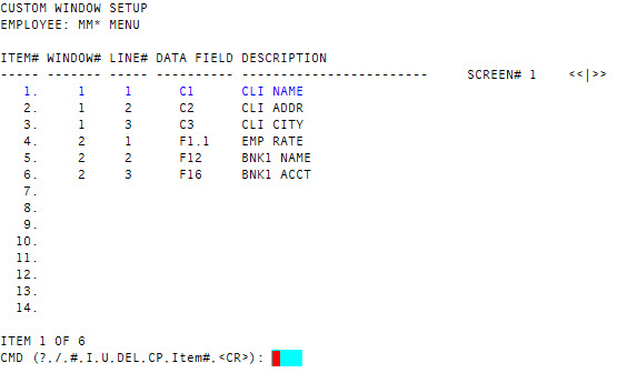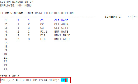 - In the CMD (?, /, #, I, CP) prompt in the Custom Window Setup screen, to insert a new window, type I, and press Enter.
