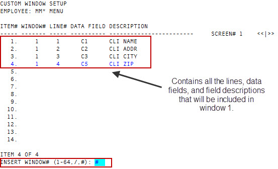 After you finish adding all the lines and fields for the window and are ready to save your changes, at the Insert Window# (1-64, /, #) prompt, type #, and press Enter.