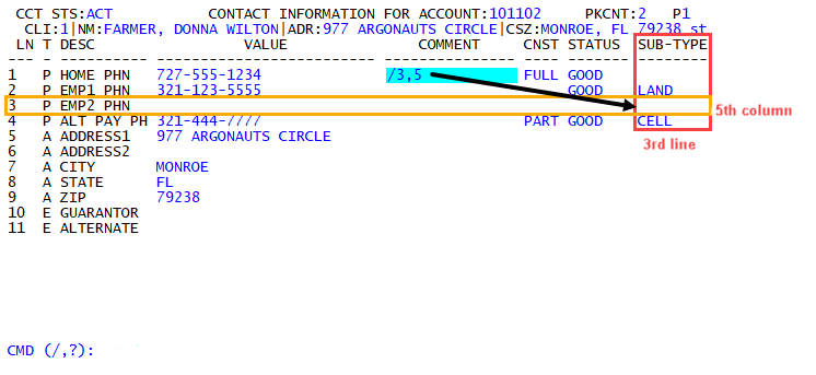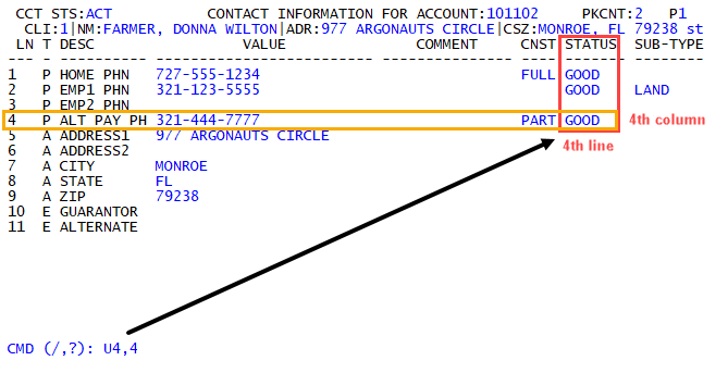 At the CMD prompt, type U, the line number, a comma, and the column number. For example, to go to the Status field of the fourth line, type U4,4.