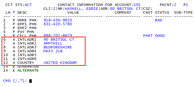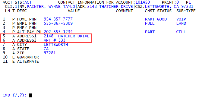 The PC screen displays all of the different contact types for the account in a table format. Each line represents a single contact type. For addresses, each part of the address has its own line on the screen. In the following example, the first line of the primary home address is line 5, the second line of the address, which includes the apartment number, is line 6, and so on for the entire address.