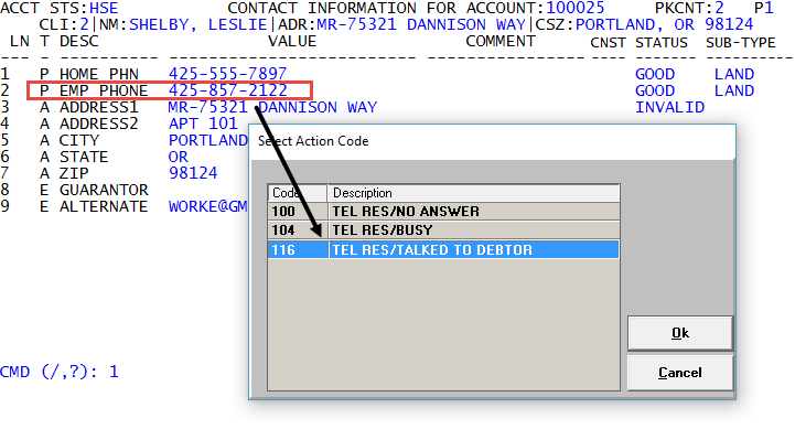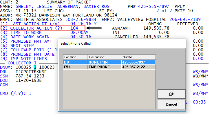 Collector screen—In the Collector Action field or account notes, enter the action code. The Collector screen then displays a list of all the phone numbers for the account, and you select the phone number you used to contact the account.
