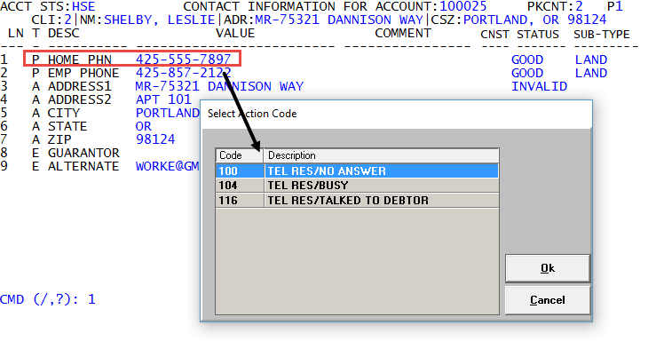 For example, a collector attempts to contact an account by calling the customer's home phone. The collector does not receive an answer, so they type /C in the Value field of the Home Phn contact type, and then select the Tel Res/No Answer action code to record the call attempt.