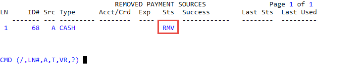 The Collector System displays the Removed Payment Sources screen and displays a removed (RMV) status code to each payment source, shown as follows:
