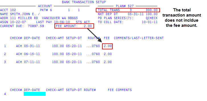 The transaction fee you entered when creating the ACH payment applies to all of the post-dated checks you enter here. Also, please note that the Total Trans field does not include the fee totals. For more information, see Charging transaction fees.