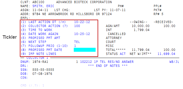 The Tickler area contains information about the collection activities performed on an account, including information regarding whether the account has previously been worked, when it will be worked again, what actions should be taken next, and whether any promised payments exist on the account.