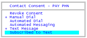 Consent allowing a collector to use a specific account contact to communicate with a debtor is set in the CNST (consent) field of the Personal Contacts (PC) screen. For example, a responsible party may grant consent to receive text messages or be called manually by a representative, but not give consent to be called by an automated dialer. These consent authorizations are maintained in the CNST field so that contacts can be limited to only those that have been authorized.
