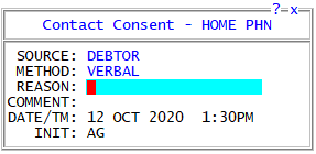 - Input the Source and Method regarding how consent was granted. For instance, if a debtor called into the agency and granted consent to be contacted, the collector would enter DEBTOR as the Source and Verbal as the Method. The Reason and Comment fields allow collectors to add additional information pertinent to the updated contact consent.